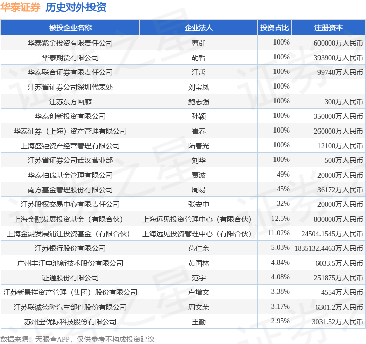 通过天眼查大数据分析,华泰证券股份有限公司共对外投资了65家企业,参与招投标项目2428次;财产线索方面有商标信息268条,专利信息112条,著作权信息30条;此外企业还拥有行政许可66个。据2024年报数据,华泰证券商誉5134.16万元,同比减98.5%。长期股权投资222.37亿元,同比增8.93%。
